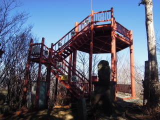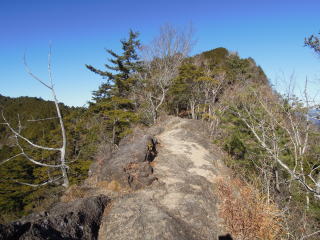 三ツ瀬登山口から杉林の中を沢沿いに登る。銀明水は涸れて水が出ていなかった。二合目からは稜線歩き。鎖や鉄ばしごが所々にある。宮標石も頂上まで続いていた。乳岩からの分岐をすぎ登っていくと馬の背岩。雪の南アルプスがきれいに見える。展望台の足元に三等三角点明神山があった。展望台からは恵那山、中央アルプス、塩見岳、荒川三山、赤石岳、聖岳、そして富士山がくっきりと見えた。こんなに見えるのは年に数回だそうだ。あったかいラーメンを食べて下山。
