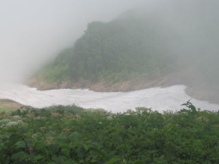 登り始めは曇っていたが、だんだん青空が現れた。このまま天気が良くなることを願いながら登っていく。ダケカンバとハイマツが登山道をおおい、枝が頭にぶつかって歩きにくい。足元にいろいろな花が次から次に現れて、花の利尻山を堪能する。9合目をすぎてからガレや火山灰だらけでロープにつかまりながら登っていく。やっとついた頂上はお花畑。花の写真を撮りまくる。景色はあいにくのガスで足元しか見えない。気を付けながら下っていくと、だんだんガスが消えて雪渓が見えてきた。ボタンキンバイの群落がきれい。見上げると頂上が見えてきた。要塞のような形だ。長い下りをおりて乾いた喉に甘露泉の水がうまかった。