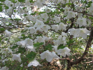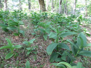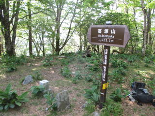 大札山から舗装がなくなり、車の底にあたらないようにゆっくり走る。山犬段からの林道コースは土砂崩れで通行止めのため、蕎麦粒山経由で往復する。大木の尾根を進むとシロヤシオが現れた。三等三角点のある蕎麦粒山の下りに、シロヤシオが咲き乱れている。五樽沢コルをすぎ、三ツ合分岐の尾根もシロヤシオが満開だ。遠くに雪山が見えた。高塚山への尾根もシロヤシオが咲いている。コバイケイソウが現れると高塚山山頂。虫が多く山犬段に引き返す。