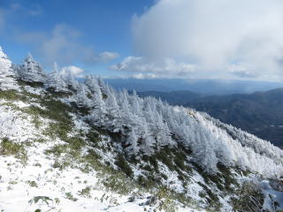 治部坂峠の駐車場にも雪、今シーズン初めての雪を踏みしめながら登っていく。木の根っこの尾根を行くと、動物の足跡があった。大きなシモバシラもあり、去年あった大きな穴は通行禁止になり、迂回路が作ってあった。横岳で休憩、ベンチにはニコニコマークがあった。青空が出てきて、樹氷がキラキラ輝いてきれいだ。まわりの山々も一面真っ白。大川入山に近づくにつれ、樹氷も大きくなっていく。雪が多いが、お目当ての羊さんも現われた。山頂は風が強く寒かったので、すぐに下山。青空が広がり、南アルプスも見ることができた。